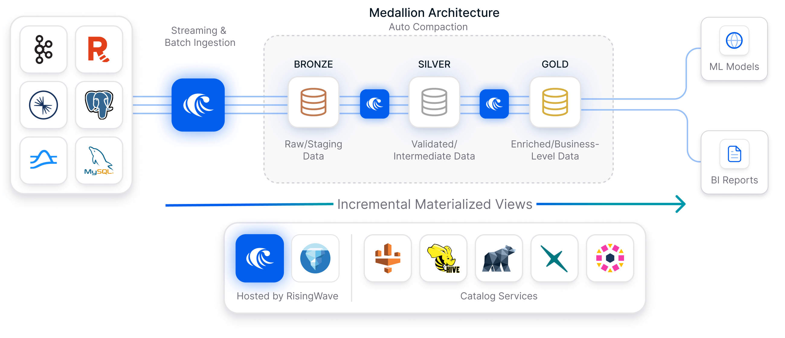 RisingWave makes data pipelines composable, allowing tables and views generated by one query to be seamlessly used as inputs for downstream queries.