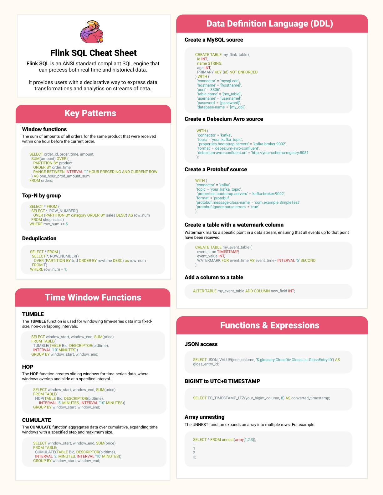 To help you master streaming SQL quickly, we’ve prepared cheat sheets for two of the most commonly used streaming SQL dialects.