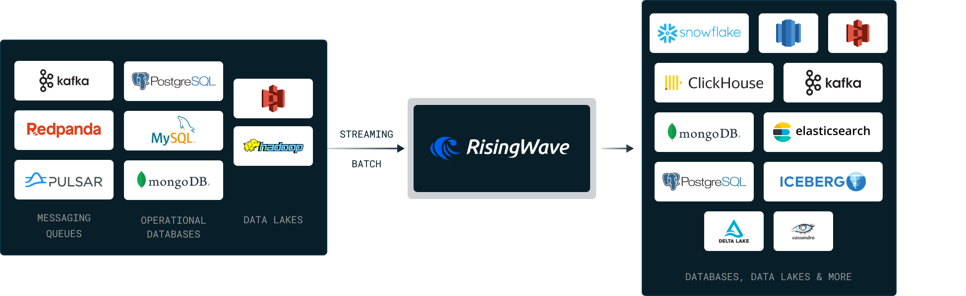 Extract: RisingWave ingests large volumes of high-velocity data of different formats efficiently from popular databases, messaging systems, and data platforms.